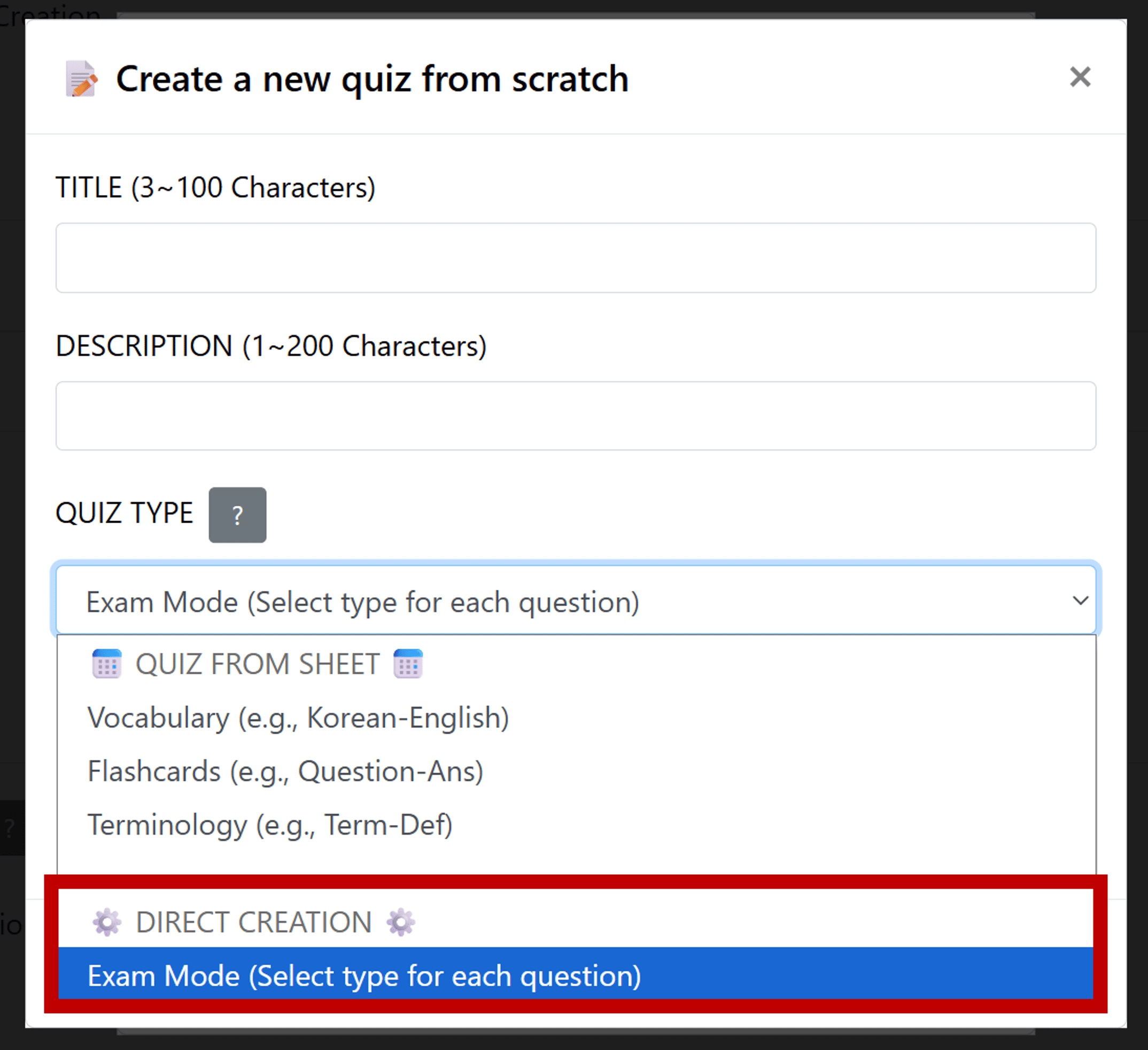 Enter the title and description, and you must select 'Exam Mode'.