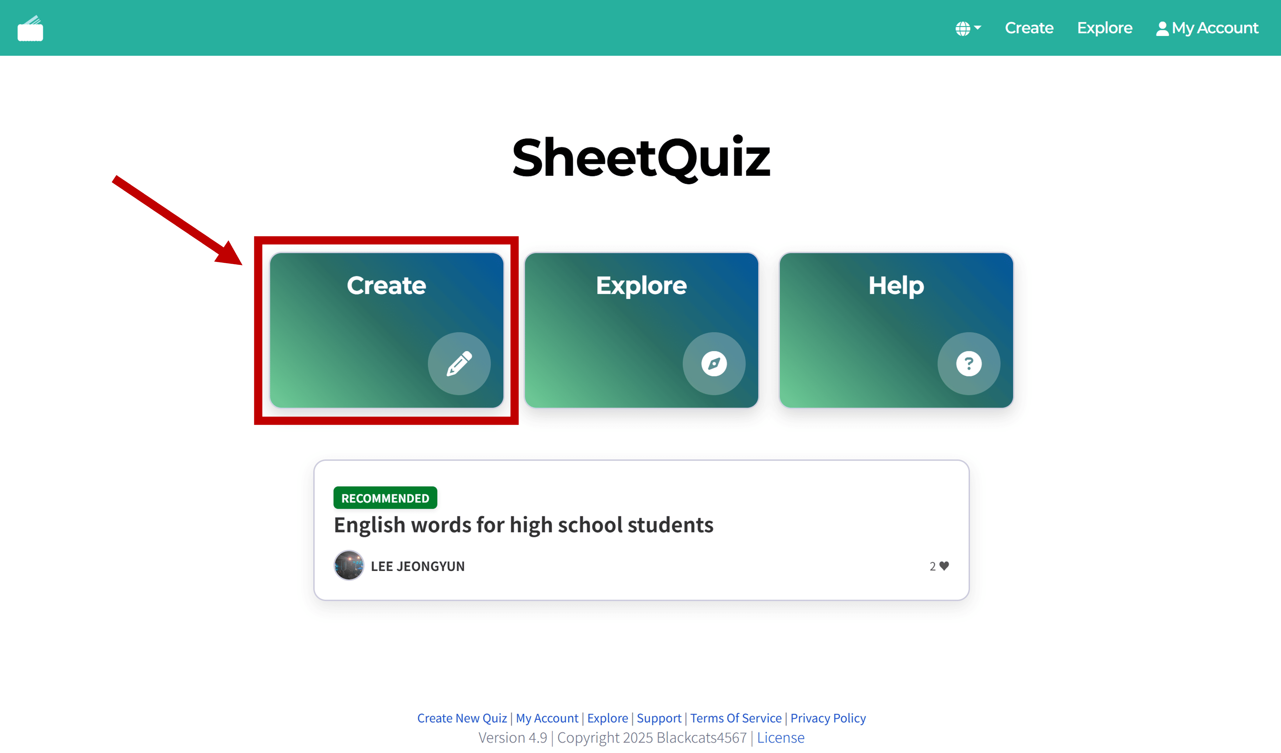 Click Create on the SheetQuiz main page.