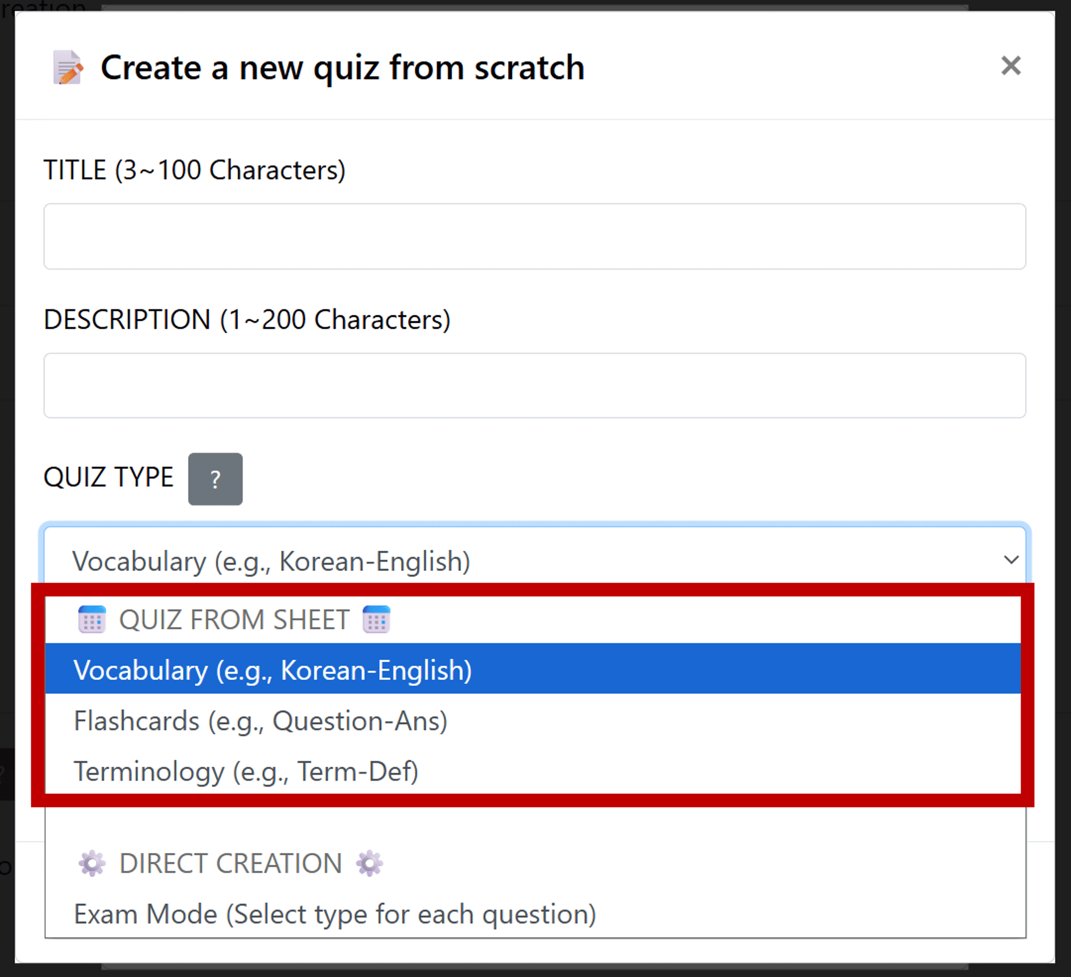 This guide assumes you are creating an vocabulary quiz, but you can use it for various purposes such as terminology quizzes or idiom quizzes.
